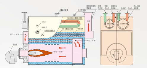 ③热效益高: 锅炉燃烧方式为湿背式三回程前烟室结构,烟管采用内外双螺纹缠绕翅片管,大幅度降低了锅炉烟室温度,使锅炉排烟温度在120℃左右,内置式热交换器的换热管采用独特的大波节螺纹管结构,提高了效果,锅炉的整体热效益大于95%以上。